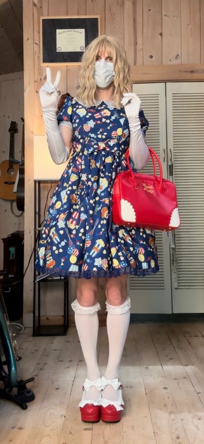 Here we have a fairly simple coord consisting of a yellow JSK paired with yellow flats. The pink in the face mask is helping to balance out the pinks in the dress, but a more conservate approach would have been to use a yellow mask. In my own critique, a pink bag might have helped balance out the pink with the face mask. With so many colors in the print, it would look nice to have some pinks and blues in the stockings to add more visual interest.